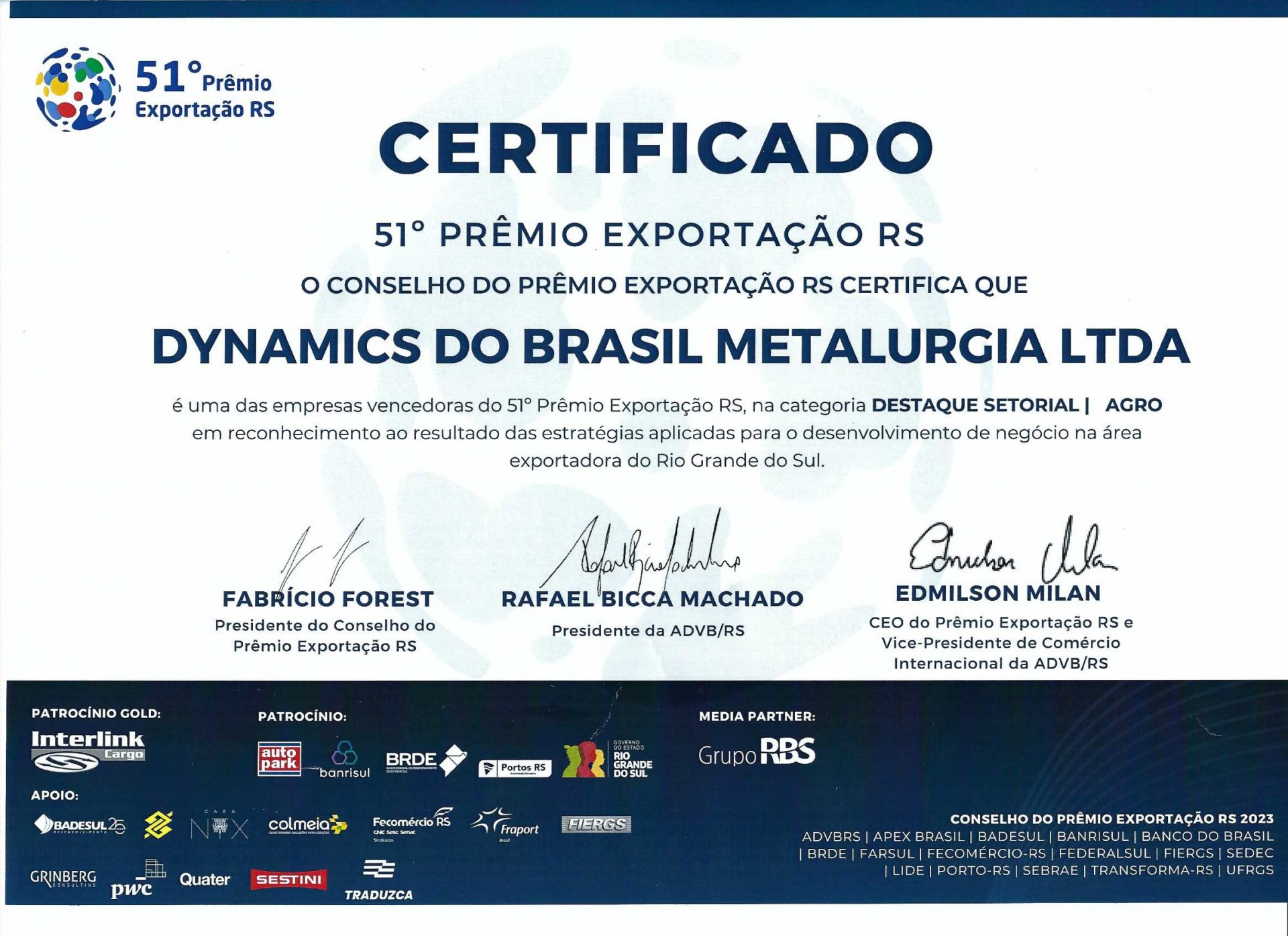 Pelo 3º ano consecutivo, a Dynamics Engates Rápidos é agraciada como uma das vencedoras do 51º Edição do Prêmio Exportação RS.