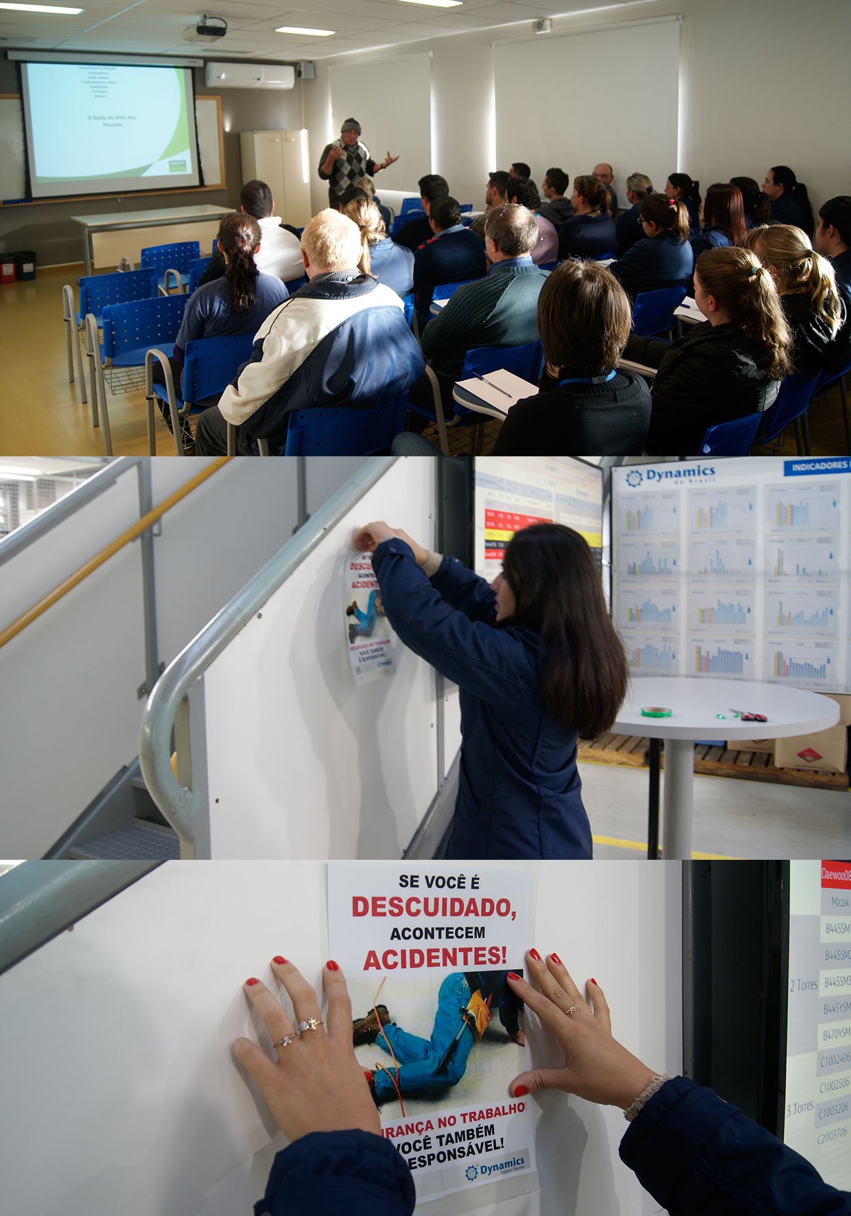 Alternando as palestras, o setor de Recursos Humanos e membros da CIPA da Dynamics promoveram campanhas internas de conscientização de normas de segurança e prevenção de acidentes de trabalho, focando no quanto é importante para a as famílias dos colaboradores que estes obedeçam às normas de segurança e mantenham-se sadios na empresa e em casa.